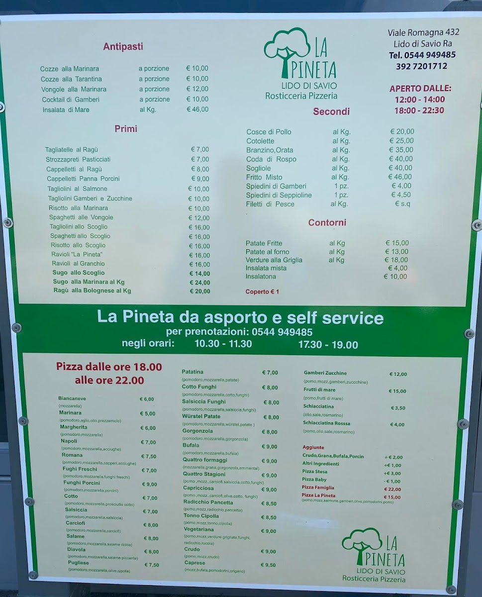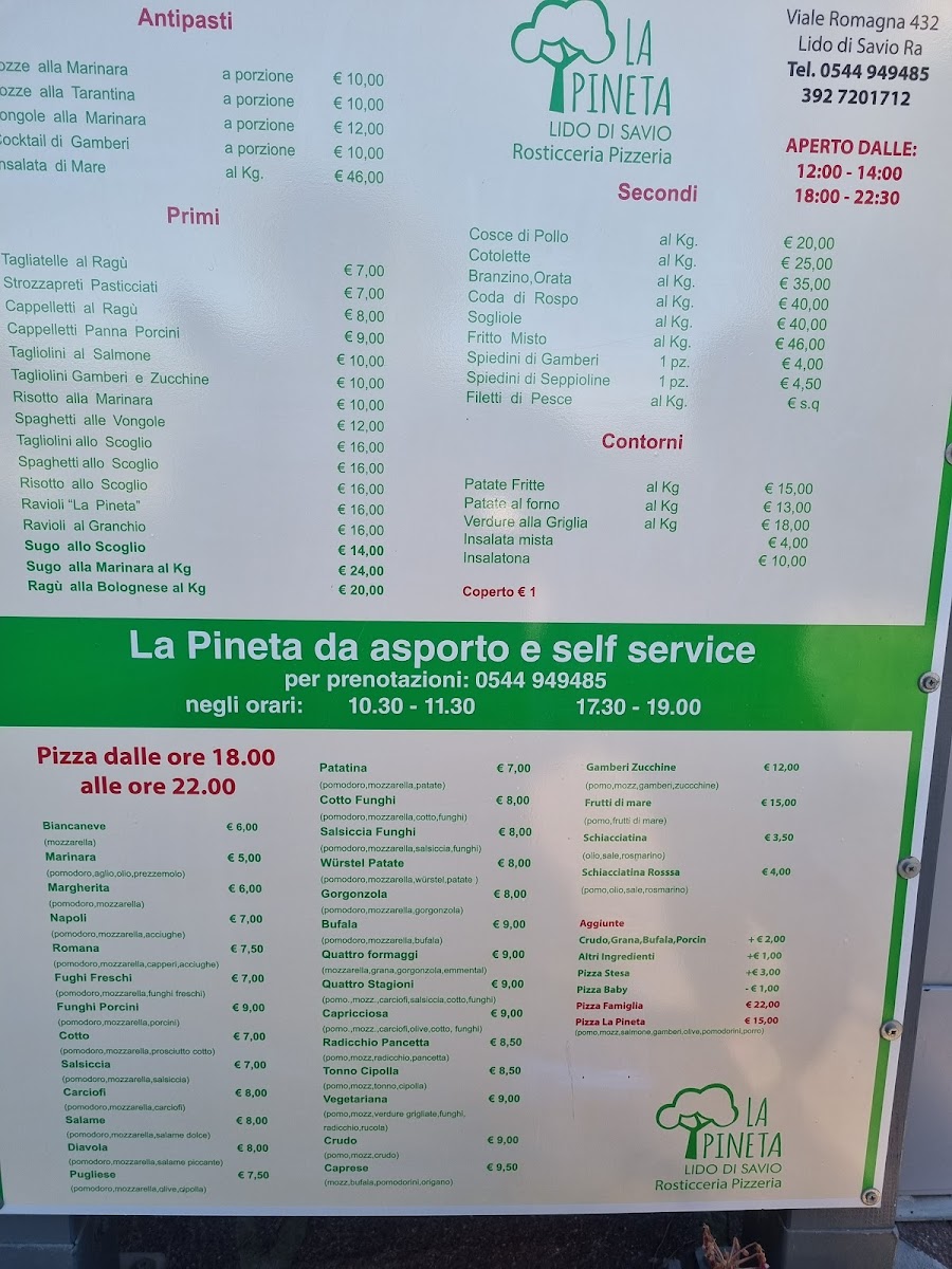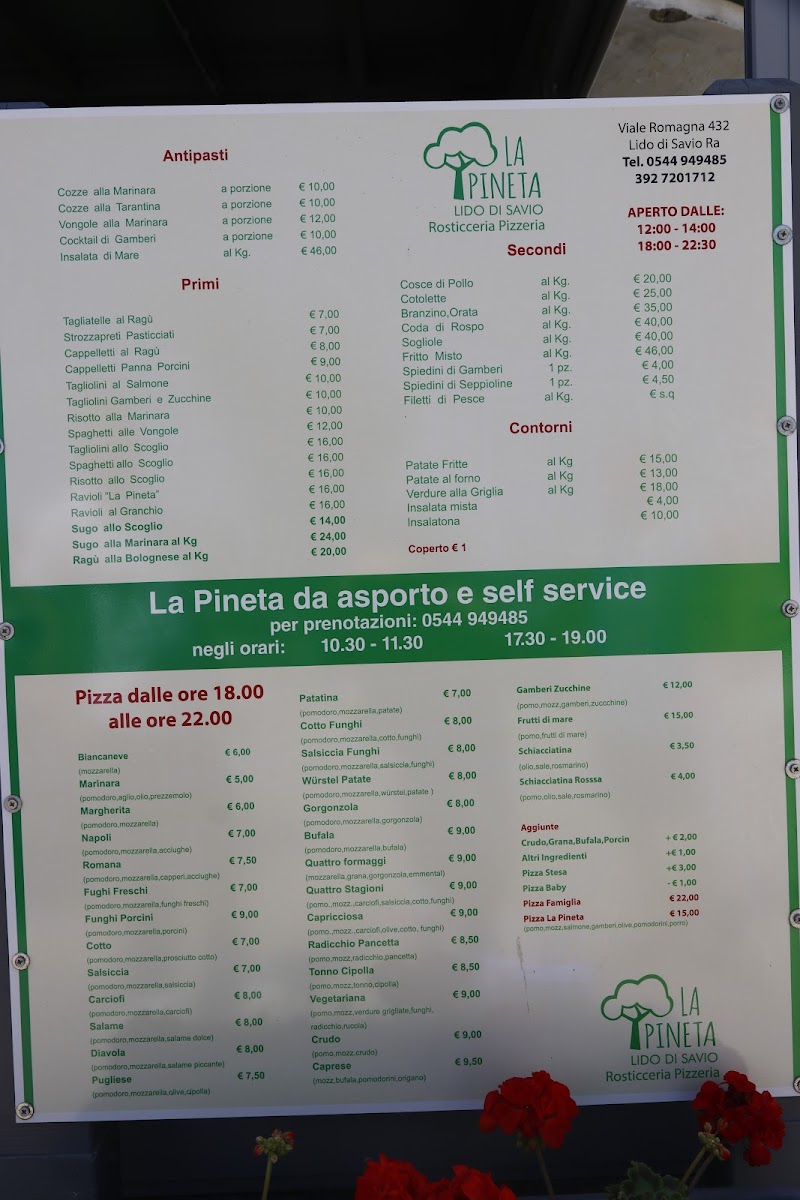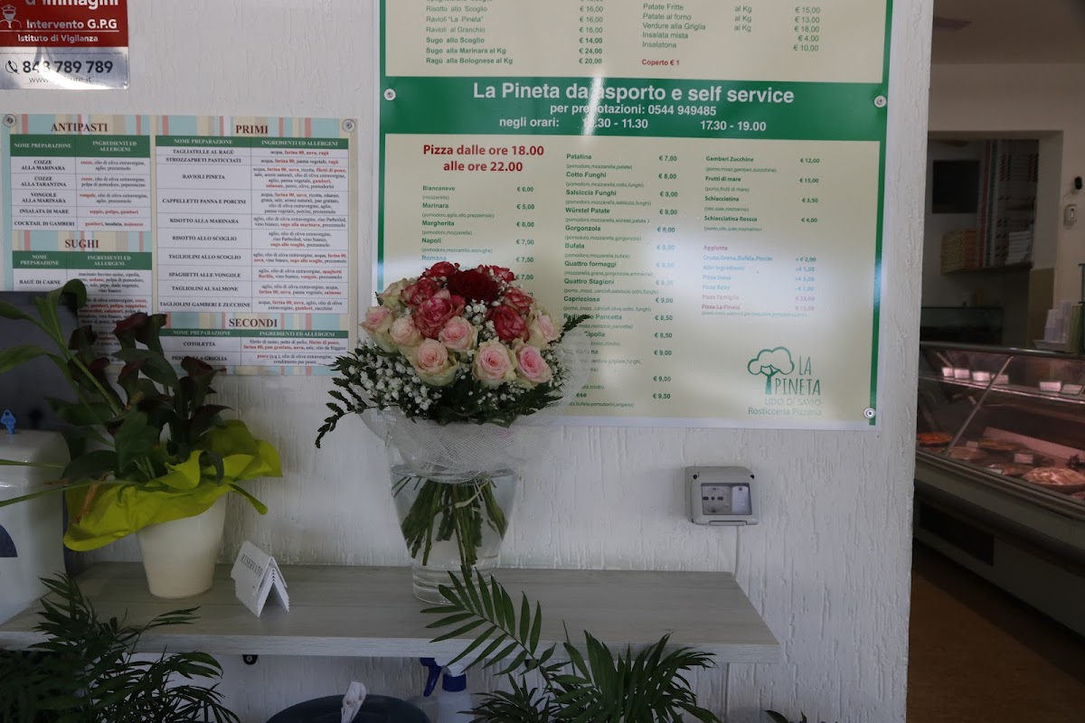 The menu at Rosticceria Pizzeria La Pineta offers a delightful selection of traditional Italian dishes that promise to satisfy a variety of tastes. For pasta lovers, the Spaghetti with Seafood stands out, combining fresh seafood with perfectly cooked spaghetti, creating a harmonious balance of flavors. The pizza selection is also impressive, with options like the classic Pizza Margherita, a simple yet delicious choice with fresh mozzarella and basil, and the Pizza Capricciosa, a rich and savory option topped with a mix of ham, mushrooms, artichokes, and olives.